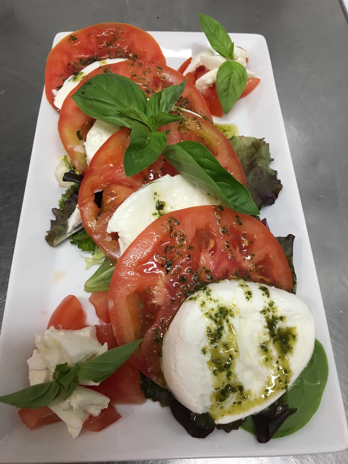 Con burrata, trozos de pistacho, salsa de pesto de pistacho y grana padano